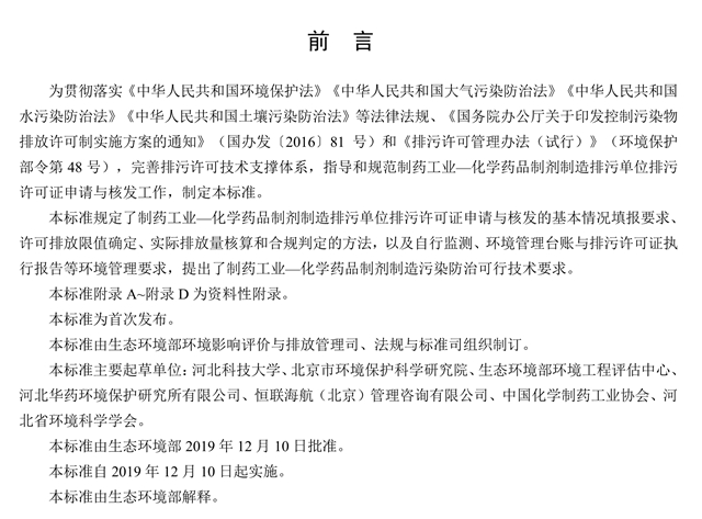 為貫徹落實(shí)《中華人民共和國環(huán)境保護(hù)法》《中華人民共和國大氣污染防治法》《中華人民共和國水污染防治法》《中華人民共和國土壤污染防治法》等法律法規(guī)、《國務(wù)院辦公廳關(guān)于印發(fā)控制污染物排放許可制實(shí)施方案的通知》(國辦發(fā)〔2016〕81號(hào))和《排污許可管理辦法(試行)》(環(huán)境保護(hù)部令第48號(hào)),完善排污許可技術(shù)支撐體系,指導(dǎo)和規(guī)范制藥工業(yè)—化學(xué)藥品制劑制造排污單位排污許可證申請(qǐng)與核發(fā)工作,制定本標(biāo)準(zhǔn)。