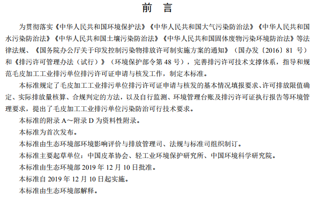 為貫徹落實(shí)《中華人民共和國環(huán)境保護(hù)法》《中華人民共和國大氣污染防治法》《中華人民共和國水污染防治法》《中華人民共和國土壤污染防治法》《中華人民共和國固體廢物污染環(huán)境防治法》等法律法規(guī)、《國務(wù)院辦公廳關(guān)于印發(fā)控制污染物排放許可制實(shí)施方案的通知》(國辦發(fā)〔2016〕81號(hào))和《排污許可管理辦法(試行)》(環(huán)境保護(hù)部令第48號(hào)),完善排污許可技術(shù)支撐體系,指導(dǎo)和規(guī)范毛皮加工工業(yè)排污單位排污許可證申請(qǐng)與核發(fā)工作,制定本標(biāo)準(zhǔn)。