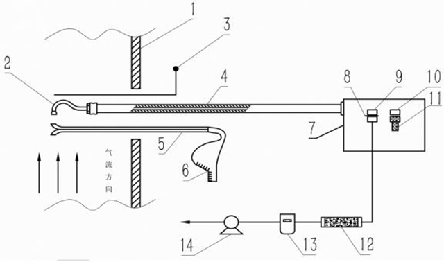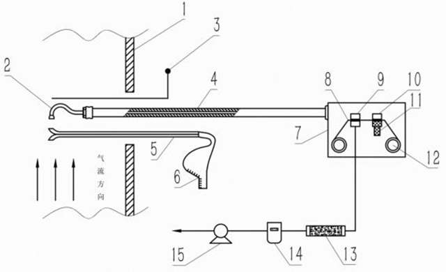 1-煙道壁;2-采樣嘴;3-溫度測量;4-采樣管;5-皮托管;6-壓力計(jì);