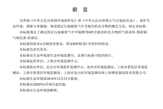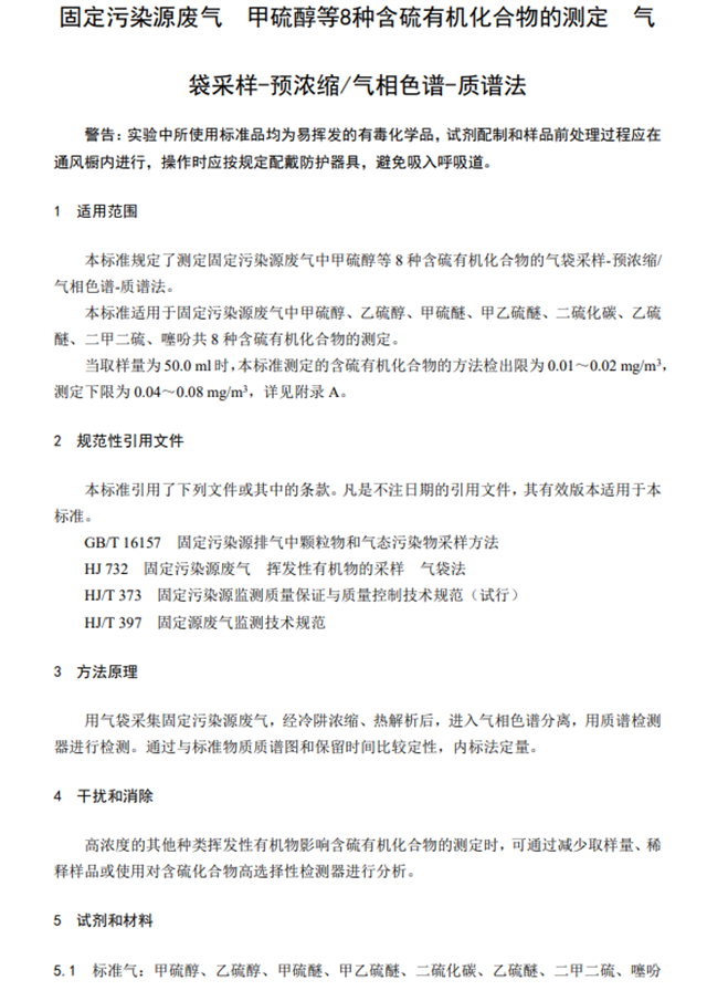 為貫徹《中華人民共和國環(huán)境保護法》和《中華人民共和國大氣污染防治法》,保護生態(tài)環(huán)境,保障人體健康,規(guī)范固定污染源廢氣中含硫有機化合物的測定方法,制定本標準。本標準規(guī)定了測定固定污染源廢氣中甲硫醇等8種含硫有機化合物的氣袋采樣-預濃縮/氣相色譜-質譜法。本標準的附錄A為規(guī)范性附錄,附錄B和附錄C為資料性附錄。本標準為首次發(fā)布。