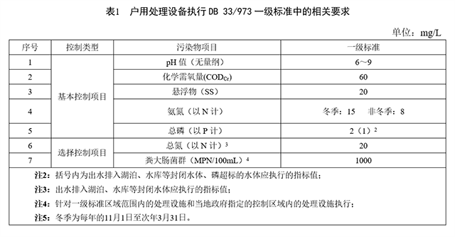 綜合考慮設(shè)施的處理規(guī)模、受納水體的環(huán)境容量、功能要求等多種因素,戶用處理設(shè)備出水直接排入GB 3838地表水Ⅱ、Ⅲ類功能水域(劃定的飲用水水源保護區(qū)和游泳區(qū)除外)、GB 3097海水二類功能水域、湖泊、水庫等封閉水域或半封閉水域時,執(zhí)行DB 33/973中一級標準中的相關(guān)要求,詳見下圖: