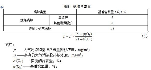 實(shí)測(cè)的鍋爐顆粒物、二氧化硫、氮氧化物、汞及其化合物的排放濃度,按公式(1)折算為基準(zhǔn)含氧量排放濃度。各類燃燒設(shè)備的基準(zhǔn)含氧量按表8規(guī)定執(zhí)行。