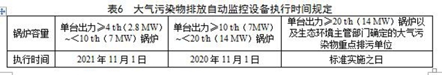 5.1.4 4t/h及以上蒸汽鍋爐、2.8MW及以上熱水鍋爐,以及生態(tài)環(huán)境主管部門(mén)確定的大氣污染物重點(diǎn)排污單位應(yīng)安裝大氣污染物排放自動(dòng)監(jiān)控設(shè)備,并與生態(tài)環(huán)境主管部門(mén)聯(lián)網(wǎng),保證設(shè)備正常運(yùn)行,執(zhí)行時(shí)間見(jiàn)表6規(guī)定。