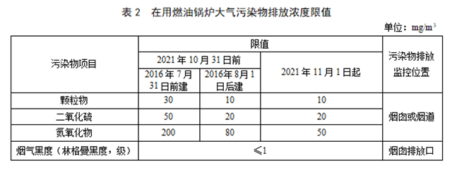 4.2 在用燃油鍋爐執(zhí)行表2中的大氣污染物排放限值。
