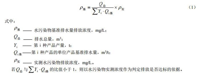 4.3 水污染物排放濃度限值適用于單位產(chǎn)品實(shí)際排水量不高于單位產(chǎn)品基準(zhǔn)排水量的情況。若單位產(chǎn)品實(shí)際排水量超過單位產(chǎn)品基準(zhǔn)排水量,須按公式(1)將實(shí)測(cè)水污染物濃度換算為水污染物基準(zhǔn)排水量排放濃度,并以水污染物基準(zhǔn)排水量排放濃度作為判定排放是否達(dá)標(biāo)的依據(jù)。產(chǎn)品產(chǎn)量和排水量統(tǒng)計(jì)周期為一個(gè)工作日。