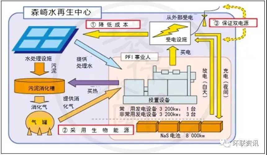 森崎水回收中心東部還設(shè)有有四個(gè)消化罐,用來(lái)從有機(jī)污泥成分中產(chǎn)生甲烷氣體,這將減少最終的污泥體積。每個(gè)消化罐內(nèi)徑28米,深度19.5米(容積12000立方米),消化溫度約為50攝氏度。為了構(gòu)建可持續(xù)發(fā)展和循環(huán)型社會(huì),為下一代營(yíng)造宜人的全球環(huán)境,森崎水回收中心正在努力利用污水處理過(guò)程中產(chǎn)生的能量,污泥和再生水來(lái)獲得資源和能源。夏季的廢水溫度低于夏季,冬季的溫度高于大氣溫度,“城市供熱”系統(tǒng)正是利用廢水溫差來(lái)實(shí)現(xiàn)區(qū)域供熱和制冷的。“城市供熱”系統(tǒng)的采用減少了化石燃料(石油,天然氣等)的使用,并有助于減少空氣污染物和電力消耗。項(xiàng)目開(kāi)始時(shí)間:2006年10月將從水再生中心獲得的處理后的廢水供應(yīng)到新的索尼公司大樓,以冷卻大樓的空調(diào)設(shè)備。空調(diào)產(chǎn)生的廢熱,通過(guò)熱交換器處理后被廢水吸收。該項(xiàng)目的環(huán)境影響是,由于冷卻設(shè)備運(yùn)行所需的電力和自來(lái)水的減少,CO2排放量每年減少約22 t。此外,與將所有熱量釋放到大氣中的常規(guī)方法相比,該項(xiàng)目中的熱量釋放到處理后的廢水中,有助于應(yīng)對(duì)熱島現(xiàn)象。 生物質(zhì)發(fā)電(與私營(yíng)企業(yè)合作)廢水處理方法中產(chǎn)生的污泥在消化池中加熱,然后污泥中的有機(jī)物變成甲烷氣,減少了污泥量。過(guò)程中產(chǎn)生的甲烷是生物質(zhì)(可再生)能源,可以被用作發(fā)電設(shè)備的燃料,每年可發(fā)電22.8 kWh。在發(fā)電設(shè)施的安裝和管理方面,森崎率先引進(jìn)了PFI(私人融資計(jì)劃:是一種公私合作的方法,將資金、技術(shù)知識(shí)和管理技能從私營(yíng)部門帶到公共機(jī)構(gòu)),它可以降低設(shè)施建設(shè)或維護(hù)/管理的成本。它也通過(guò)可交易的綠色證書作為環(huán)境價(jià)值能源轉(zhuǎn)讓給第三方。該中心還安裝了世界上最大的NaS電池設(shè)備,用于全天的分布式電力負(fù)載:在夜間有效地使用低成本的電力,并在用電高峰期減少使用電池供電。
