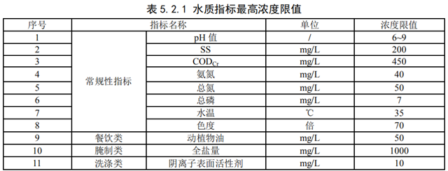 5.2.1 排水戶污水水質(zhì)常規(guī)性指標(biāo)包括 pH 值、SS、CODCr、氨氮、總氮、總磷、水溫、色度等 8 項,其中餐飲類廢水應(yīng)增加動植物油指標(biāo)的檢測,食品腌制類污水應(yīng)增加全鹽量指標(biāo)的檢測,洗滌類污水應(yīng)增加陰離子表面活性劑的檢測;水質(zhì)指標(biāo)最高濃度限值應(yīng)符合表 1要求。