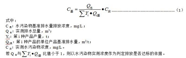 4.2.6水污染物排放濃度限值適用于單位產(chǎn)品實際排水量不高于單位產(chǎn)品基準(zhǔn)排水量的情況。若單位產(chǎn)品實際排水量超過單位產(chǎn)品基準(zhǔn)排水量,應(yīng)按公式(1)將實測水污染物濃度換算為水污染物基準(zhǔn)水量排放濃度,并以水污染物基準(zhǔn)水量排放濃度作為判定排放是否達(dá)標(biāo)的依據(jù)。產(chǎn)品產(chǎn)量和排水量統(tǒng)計周期為一個工作日。