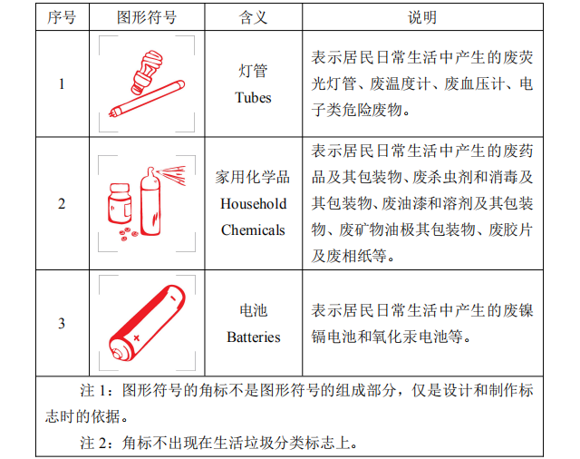 2 有害垃圾:表示《國家危險廢物名錄》中的家庭源危險廢物,包括燈管、家用化學品和電池等。