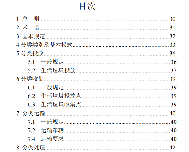本標準的主要技術內容是:1.總則;2.術語;3.基本規(guī)定;4.分類類別及基本模式;5.分類投放;6.分類收集;7.分類運輸;8.分類處理。