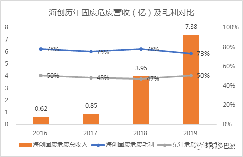 與之對應的是收入猛增。從2016年堯柏環(huán)保并表、正式為公司帶來6198萬收入起,到2019年增加至7.38億元,4年收入增長12倍!與此同時,憑借水泥窯的先天優(yōu)勢及公司管理能力,其毛利基本維持在75%的高水平段位,顯著高于危廢處置龍頭東江環(huán)保的毛利水平(約49%),協(xié)同處置帝國輪廓初步顯現(xiàn)。