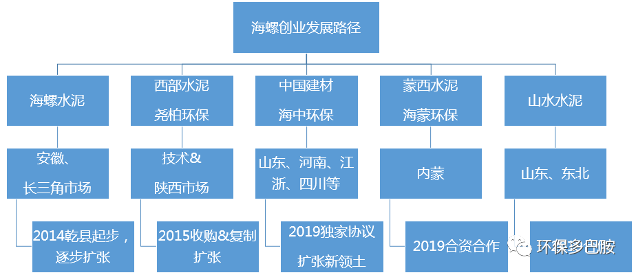 由于水泥行業(yè)市場格局較為固定,為了進入海螺集團影響力較小地區(qū)(海螺主要輻射安徽及長三角地區(qū)),則必須與其他水泥企業(yè)合作。2019年伴隨海創(chuàng)在水泥窯協(xié)同方面技術的成熟與管理的優(yōu)勢,公司有了將潛在對手變成合作伙伴的資本,從而開啟全國異地擴張節(jié)奏!