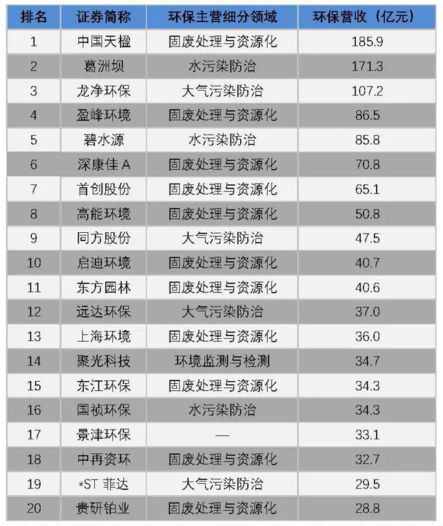 2019年A股環(huán)保上市公司環(huán)保營(yíng)收TOP20