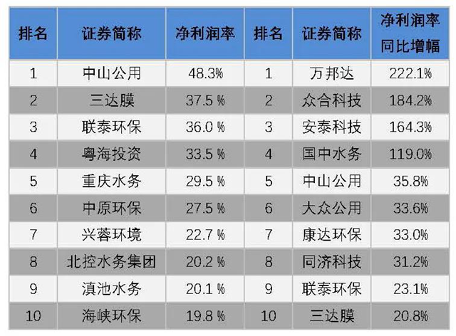 2019年水污染防治(A股+港股)環(huán)保上市公司凈利潤(rùn)率及其同比增幅TOP10