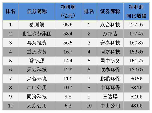 2019年水污染防治(A股+港股)環(huán)保上市公司凈利潤(rùn)及其同比增幅TOP10