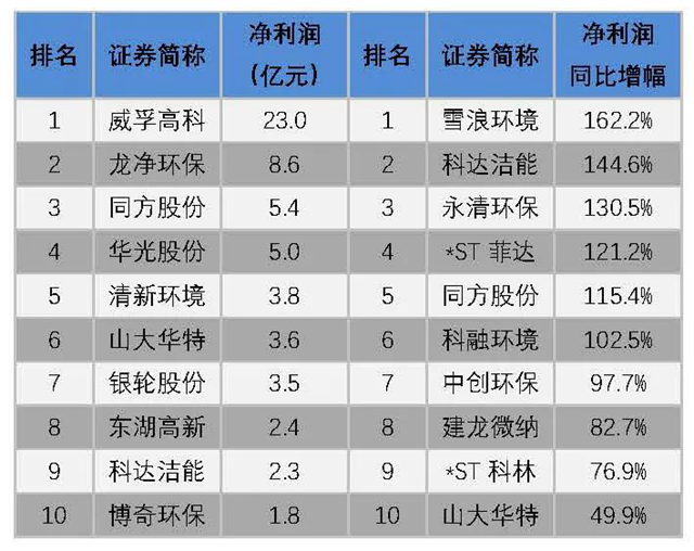 2019年大氣污染防治(A股+港股)環(huán)保上市公司凈利潤(rùn)及其同比增幅TOP10