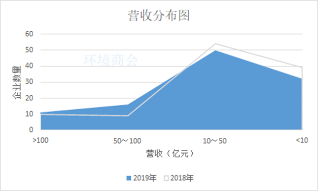 從營收分布來看,相較于2018年,2019年度營收在50億~100億區(qū)間的企業(yè)數(shù)量有所提升,從9家上升至16家,營收在10億~50億的企業(yè)數(shù)量為50家,低于10億有32家。其中,高能環(huán)境、瀚藍環(huán)境、洪城水業(yè)等營收首破50億。