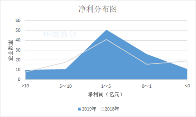 從凈利分布來看。2019年,10家企業(yè)凈利超10億,盈利水平在5億到10億之間的企業(yè)11家,這一數(shù)字較2018年減少7家。此外,近半數(shù)企業(yè)的歸母凈利集中在1億~5億之間,而盈利水平在1億以下的企業(yè)有26家,這兩部分企業(yè)數(shù)據(jù)合計達77家,較2018年增加了20家。虧損企業(yè)數(shù)量則相對減少,為11家,包括津膜科技、鐵漢生態(tài)、天翔環(huán)境、凱迪生態(tài)、盛運環(huán)保、中創(chuàng)環(huán)保等,這些企業(yè)除鐵漢生態(tài)、津膜科技外基本在2018年已經(jīng)陷入虧損狀態(tài),至今尚未扭轉(zhuǎn),虧損最為嚴重的是盛運環(huán)保,虧損額度達20億。