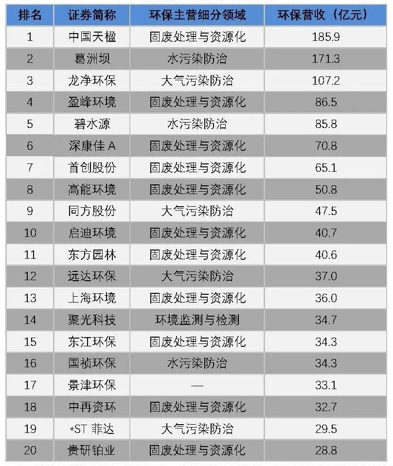 2019年A股環(huán)保上市公司環(huán)保營收TOP20: