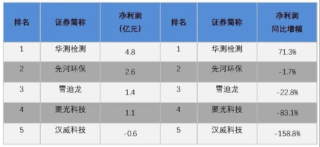 2019年環(huán)境監(jiān)測與檢測A股環(huán)保上市公司凈利潤及其同比增幅排名: