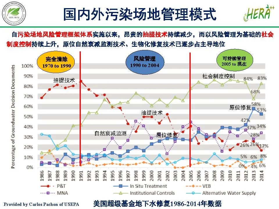 我國(guó)自污染場(chǎng)地風(fēng)險(xiǎn)管理框架體系實(shí)施以來(lái),昂貴的抽提技術(shù)持續(xù)減少,而以風(fēng)險(xiǎn)管理為基礎(chǔ)的社會(huì)制度控制持續(xù)上升,原位自然衰減監(jiān)測(cè)技術(shù),生物化修復(fù)技術(shù)已逐步占主導(dǎo)地位。本文從專(zhuān)家視角綜述了場(chǎng)地土壤與地下水污染風(fēng)險(xiǎn)管控技術(shù)。