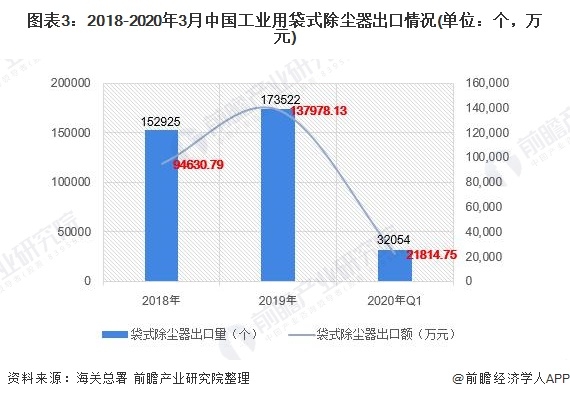 經(jīng)過(guò)海關(guān)代碼查詢,2019年工業(yè)用袋式除塵器(84213922)的出口數(shù)量為17.35萬(wàn)個(gè),出口額為13.80億元;截至2020年3月工業(yè)用袋式除塵器(84213922)的出口數(shù)量為3.21萬(wàn)個(gè),出口額為2.18億元。