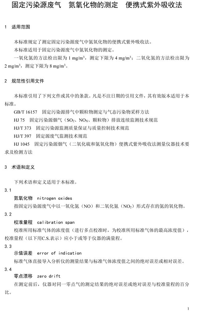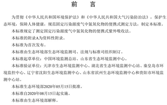為貫徹《中華人民共和國環(huán)境保護(hù)法》和《中華人民共和國大氣污染防治法》,保護(hù)生態(tài)環(huán)境,保障人體健康,規(guī)范固定污染源廢氣中氮氧化物的便攜式測定方法,制定本標(biāo)準(zhǔn)。本標(biāo)準(zhǔn)規(guī)定了測定固定污染源廢氣中氮氧化物的便攜式紫外吸收法。本標(biāo)準(zhǔn)的附錄A為資料性附錄。本標(biāo)準(zhǔn)為首次發(fā)布。