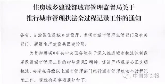 各省、自治區(qū)住房城鄉(xiāng)建設(shè)廳,直轄市城市管理主管部門及有關(guān)部門,新疆生產(chǎn)建設(shè)兵團(tuán)建設(shè)局:為貫徹落實(shí)《中共中央國務(wù)院關(guān)于深入推進(jìn)城市執(zhí)法體制改革改進(jìn)城市管理工作的指導(dǎo)意見》精神,促進(jìn)嚴(yán)格規(guī)范公正文明執(zhí)法,決定在縣級(jí)以上城市管理部門推行城市管理執(zhí)法全過程記錄工作?,F(xiàn)就有關(guān)事項(xiàng)通知如下:各地城市管理部門要通過文字、音像等記錄方式,對(duì)執(zhí)法活動(dòng)全過程進(jìn)行記錄,客觀、公正、完整地記錄執(zhí)法工作情況和相關(guān)證據(jù),實(shí)現(xiàn)全過程留痕和可回溯管理。規(guī)范執(zhí)法文書的制作和使用,確保執(zhí)法文書和案卷完整準(zhǔn)確、合法規(guī)范。合理配備并使用執(zhí)法記錄儀等現(xiàn)場(chǎng)執(zhí)法記錄設(shè)備和視音頻資料傳輸、存儲(chǔ)、等設(shè)備。對(duì)現(xiàn)場(chǎng)執(zhí)法活動(dòng)中容易引發(fā)爭(zhēng)議和糾紛的,應(yīng)當(dāng)實(shí)行全過程音像記錄。積極利用大數(shù)據(jù)、云計(jì)算、物聯(lián)網(wǎng)等信息技術(shù),結(jié)合數(shù)字化城市管理平臺(tái)建設(shè)和辦公自動(dòng)化系統(tǒng)建設(shè)等,探索成本低、效果好、易保存、不能刪改的音像記錄方式,提高執(zhí)法記錄的信息化水平。做好執(zhí)法文書和視音頻資料的管理和存儲(chǔ),逐步實(shí)現(xiàn)與數(shù)字化城市管理信息系統(tǒng)關(guān)聯(lián)共享。建立健全執(zhí)法全過程記錄保存、管理、使用等工作制度。定期組織對(duì)執(zhí)法文書和視音頻資料進(jìn)行抽查檢查。充分發(fā)揮全過程記錄信息在案卷評(píng)查、數(shù)據(jù)統(tǒng)計(jì)分析、執(zhí)法監(jiān)督等工作中的作用。各地要充分認(rèn)識(shí)推行城市管理執(zhí)法全過程記錄工作的重要意義,切實(shí)落實(shí)工作要求,配備相關(guān)儀器設(shè)備,嚴(yán)格規(guī)范記錄行為,妥善保管使用記錄信息,確保執(zhí)法全過程記錄工作有效推行。住房城鄉(xiāng)建設(shè)部城市管理監(jiān)督局