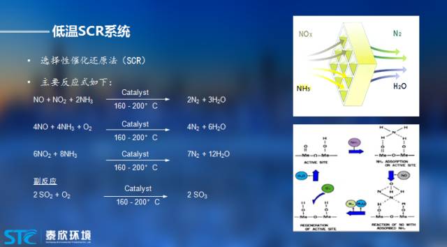 上圖是低溫SCR的反應(yīng)機(jī)理。在170-190度的條件下可以降低氮氧化物,把氮氧化物分解成氮?dú)夂退?。該工藝有著精?xì)化的系統(tǒng)設(shè)計(jì),包括反應(yīng)器的設(shè)計(jì)、催化劑的選擇、反應(yīng)條件的控制等。工藝的排放值約為:氮氧化物是到50毫克,二噁英0.01ngTEQ/Nm3。運(yùn)行費(fèi)用約為18.5元/噸垃圾。