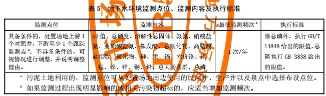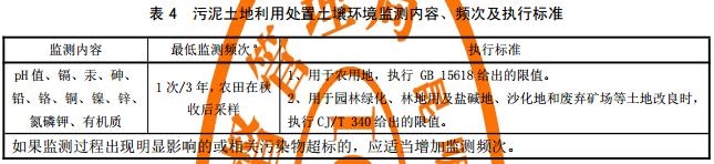 污泥填埋處置的,應(yīng)按GB 18599、GB 16889開展環(huán)境影響跟蹤監(jiān)測(cè);污泥土地利用處置的,處置過程結(jié)束后應(yīng)按表5開展環(huán)境影響跟蹤監(jiān)測(cè),監(jiān)測(cè)周期不應(yīng)低于10年;采用其他處置方式時(shí),則執(zhí)行與其對(duì)應(yīng)的相關(guān)標(biāo)準(zhǔn)。