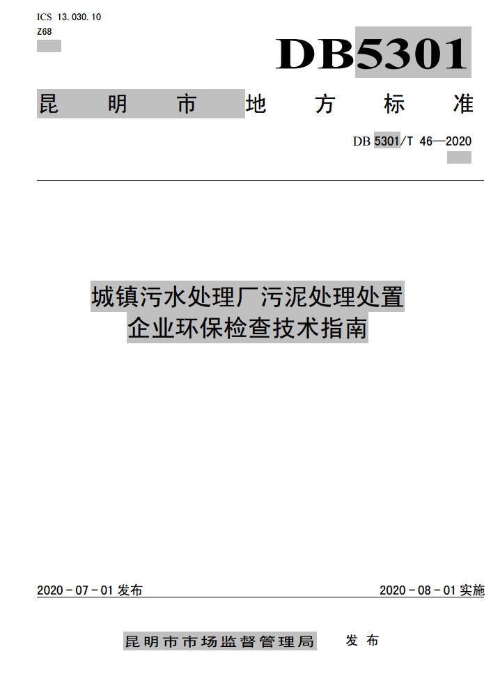 昆明市地方標(biāo)準(zhǔn)《城鎮(zhèn)污水處理廠污泥處理處置企業(yè)環(huán)保檢查技術(shù)指南》(DB 5301/T 46—2020)于7月1日發(fā)布,將于2020年8月1日起施行。