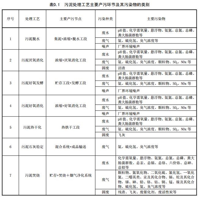 D.3 污泥處置工藝主要產(chǎn)污環(huán)節(jié)及其污染物的類別,見表D.2。