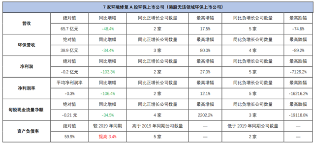 環(huán)境修復領域(7家):營收和環(huán)保營收規(guī)模均收縮,獲利能力大幅下滑,現(xiàn)金流情況不及上年同期,負債水平上升。
