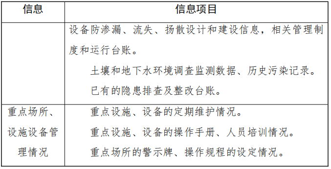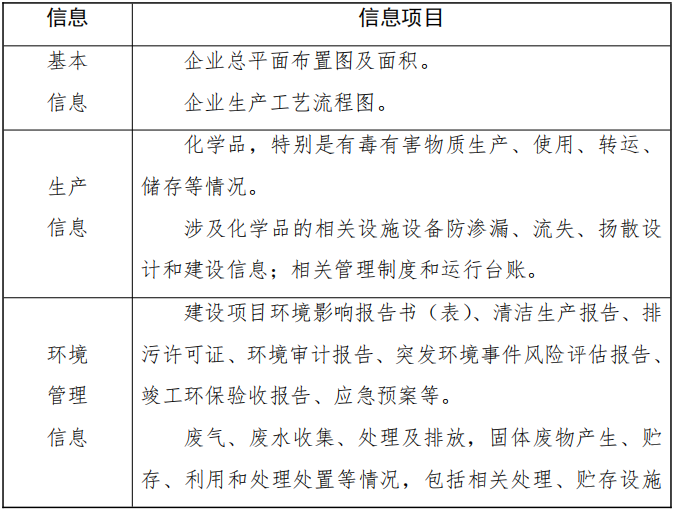 重點(diǎn)收集企業(yè)基本信息、生產(chǎn)信息、環(huán)境管理信息等(包括但不限于表1列舉的資料清單),并梳理企業(yè)有毒有害物質(zhì)信息清單。