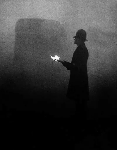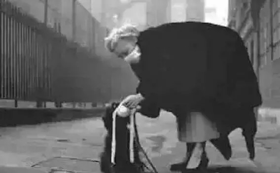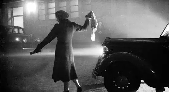 1938年的倫敦,一名女子拿手電筒給霧霾中的車(chē)引路。