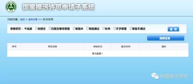 (1)排污單位點擊進入“許可證變更”模塊,點擊頁面中的“我要變更”按鈕,即可填寫排污許可證變更申請。