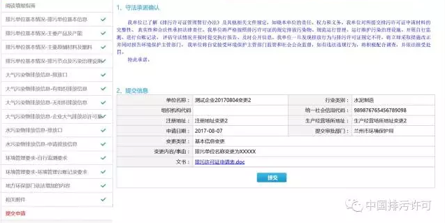 排污單位填寫完所有信息后,點擊“提交”按鈕,即完成排污許可證變更申報。系統(tǒng)會對變更內(nèi)容進行標識,綠色文字為排污單位變更過程中新增內(nèi)容,紅色文字為排污單位變更過程中修改內(nèi)容。