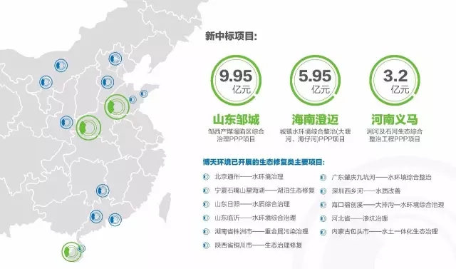 近日,博天環(huán)境集團(603603.SH)通過聯(lián)合體合作方式分別贏取了位于山東省鄒城市、河南省義馬市和海南省澄邁縣的三個生態(tài)修復類項目。其中山東省鄒城市鄒西產煤塌陷區(qū)綜合治理PPP項目,投資概算約9.95億元;河南省義馬市澗河及石河生態(tài)綜合整治工程(PPP),項目總投資約3.2億元;海南省澄邁縣城鎮(zhèn)水環(huán)境綜合整治(大塘河、海仔河)PPP項目,估算總投資5.95億元。