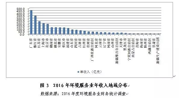 2016年,環(huán)境服務(wù)業(yè)在全國各地均有分布,且具有較高的區(qū)域集中度。54%以上的年收入來自于排名前5的地區(qū),僅2%來自排名最后的10個?。ㄗ灾螀^(qū)、直轄市),分布格局與2015年基本一致。