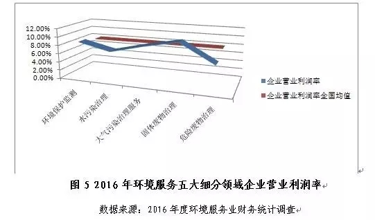 從盈利情況看,環(huán)境保護(hù)監(jiān)測、水污染治理、大氣污染治理、固體廢物治理和危險廢物治理五大細(xì)分領(lǐng)域中,僅固體廢物治理和危險廢物治理領(lǐng)域的2016年營業(yè)利潤率較2015年有所提高,固體廢物治理領(lǐng)域以10.4%的營業(yè)利潤率成為五領(lǐng)域中盈利能力最高的細(xì)分行業(yè),危險廢物治理領(lǐng)域營業(yè)利潤率同比增幅最高,約94.2%;環(huán)境保護(hù)監(jiān)測、大氣污染治理和水污染治理三領(lǐng)域的2016年營業(yè)利潤率同比分別下滑18.9%、11.3%和9.0%。
