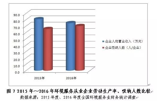 2016年,環(huán)境服務(wù)從業(yè)企業(yè)人均營業(yè)收入74.8萬元,同比下跌7.5%。從業(yè)企業(yè)勞動生產(chǎn)率的小幅下滑可能與企業(yè)吸納從業(yè)人數(shù)的增長有關(guān),2016年業(yè)內(nèi)企業(yè)平均吸納人數(shù)為70人/企業(yè),同比提高7.2%。