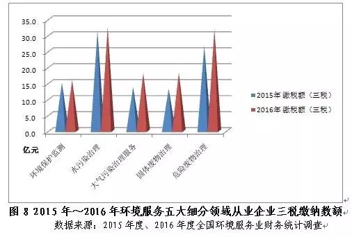 2016年企業(yè)繳納的營業(yè)稅金及附加、管理費用中的稅金、應(yīng)交增值稅之和同比增長18.5%,達(dá)125.7億元。五大細(xì)分領(lǐng)域中,水污染治理、危險廢物治理企業(yè)分別以32.5億元、31.9億元位居五大細(xì)分領(lǐng)域三稅繳納額的前兩位,分別貢獻(xiàn)了三稅總額的25.8%和25.4%。固體廢物治理企業(yè)2016年繳納三稅總額同比增速最大,達(dá)37.0%,這可能歸因于2016年我國城鎮(zhèn)化的深入推進(jìn),帶動了固體廢物處理領(lǐng)域市場空間的不斷擴大,以及該領(lǐng)域明顯提高的營業(yè)利潤率。