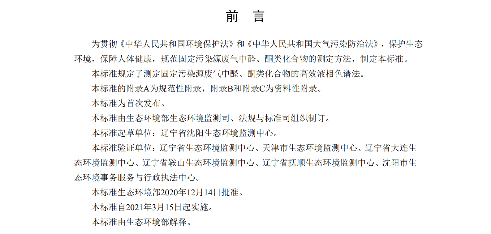 為貫徹《中華人民共和國環(huán)境保護(hù)法》和《中華人民共和國大氣污染防治法》,保護(hù)生態(tài) 環(huán)境,保障人體健康,規(guī)范固定污染源廢氣中醛、酮類化合物的測定方法,制定本標(biāo)準(zhǔn)。