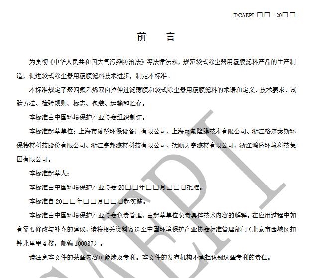 為規(guī)范袋式除塵器用覆膜濾料產(chǎn)品的生產(chǎn)制造,促進(jìn)袋式除塵器用覆膜濾料技術(shù)進(jìn)步,我會(huì)下達(dá)編制中國(guó)環(huán)境保護(hù)產(chǎn)業(yè)協(xié)會(huì)標(biāo)準(zhǔn)《袋式除塵器用覆膜濾料技術(shù)要求》。目前,已完成標(biāo)準(zhǔn)的征求意見(jiàn)稿。根據(jù)《中國(guó)環(huán)境保護(hù)產(chǎn)業(yè)協(xié)會(huì)標(biāo)準(zhǔn)管理辦法》的規(guī)定,現(xiàn)將該標(biāo)準(zhǔn)征求意見(jiàn)稿和有關(guān)材料印送給你們,請(qǐng)研究并提出書面意見(jiàn),于2021年2月10日前反饋我會(huì)。