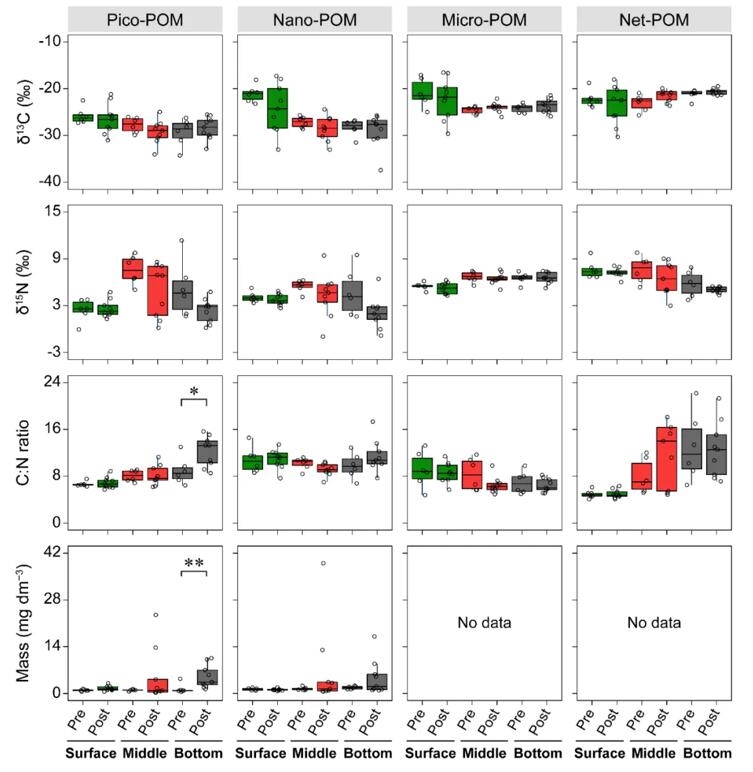 圖2 臺(tái)風(fēng)前后顆粒有機(jī)物碳氮同位素、化學(xué)計(jì)量和質(zhì)量的變化