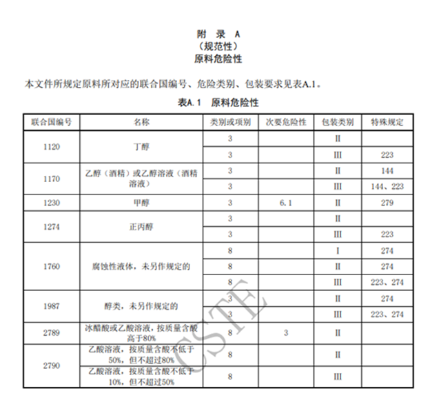 本文件所規(guī)定原料所對(duì)應(yīng)的聯(lián)合國(guó)編號(hào)、危險(xiǎn)類別、包裝要求見表A.1。