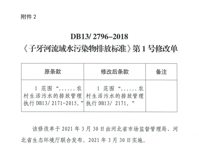 2.DB13/ 2796-2018《子牙河流域水污染物排放標準》第1號修改單