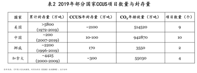 當(dāng)前,我國每年CCUS封存量僅為10——100萬噸,遠(yuǎn)低于美國每年的2100萬噸。截至2019年底,我國二氧化碳累積封存量200萬噸,遠(yuǎn)低于美國的5800萬噸(見表2)。