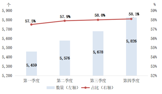 綠色PPP項目數(shù)量繼續(xù)保持平穩(wěn)增長,占比小幅增加。從綠色PPP項目數(shù)量看,項目數(shù)量保持平穩(wěn)增長,截至2020年末,累計綠色PPP項目數(shù)量達(dá)5826個,較2019年末新增410個,增加7.57%;綠色PPP項目占比進(jìn)一步上升,從2019年末的57%提升到58.1%。