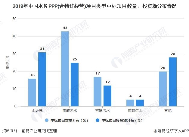 2019年,水務(wù)PPP(合特許經(jīng)營)中標(biāo)項(xiàng)目數(shù)量超過400個,投資額近3000億。從項(xiàng)目數(shù)量分布上看,市政污水處理特許經(jīng)營占主要部分,占比43%;從項(xiàng)目金額分布上看,水環(huán)境PPP占比最大,占比31%。
